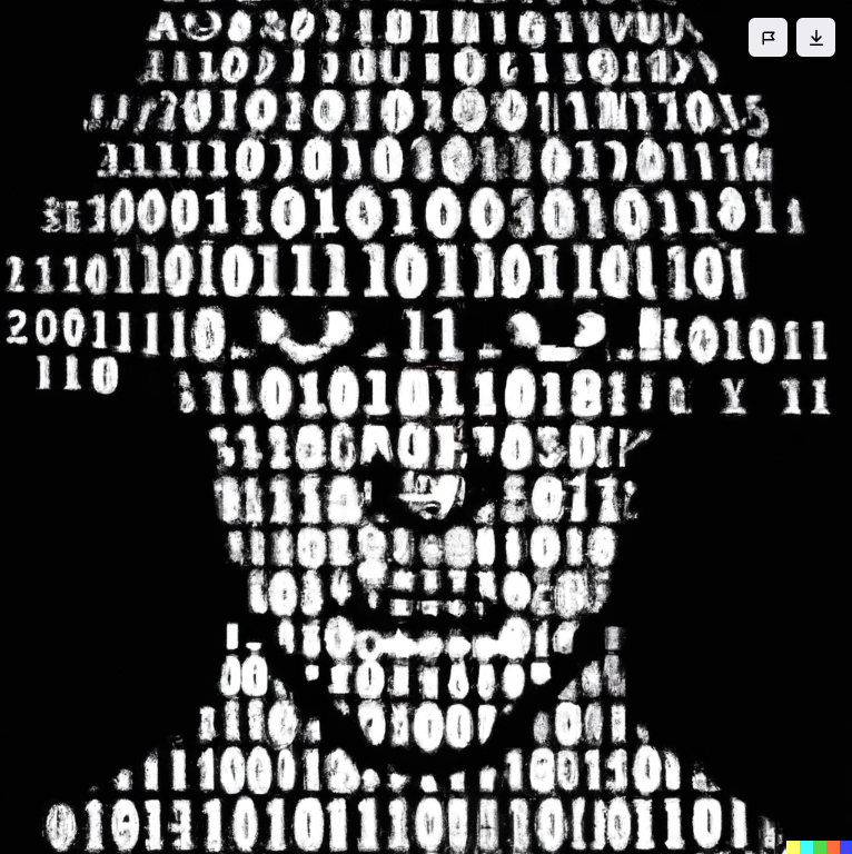 An output created by DALL-E 2 with the input, “binary code forming a face of a humanoid robot”