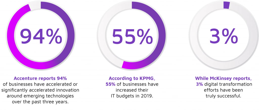 Summing up, digital transformations involve multiple factors. This complexity is one of the main reasons only 3% of organizations report completely successful transformation journeys. Therefore, it’s important that businesses find the right technology partners to help them bring their visions to life.