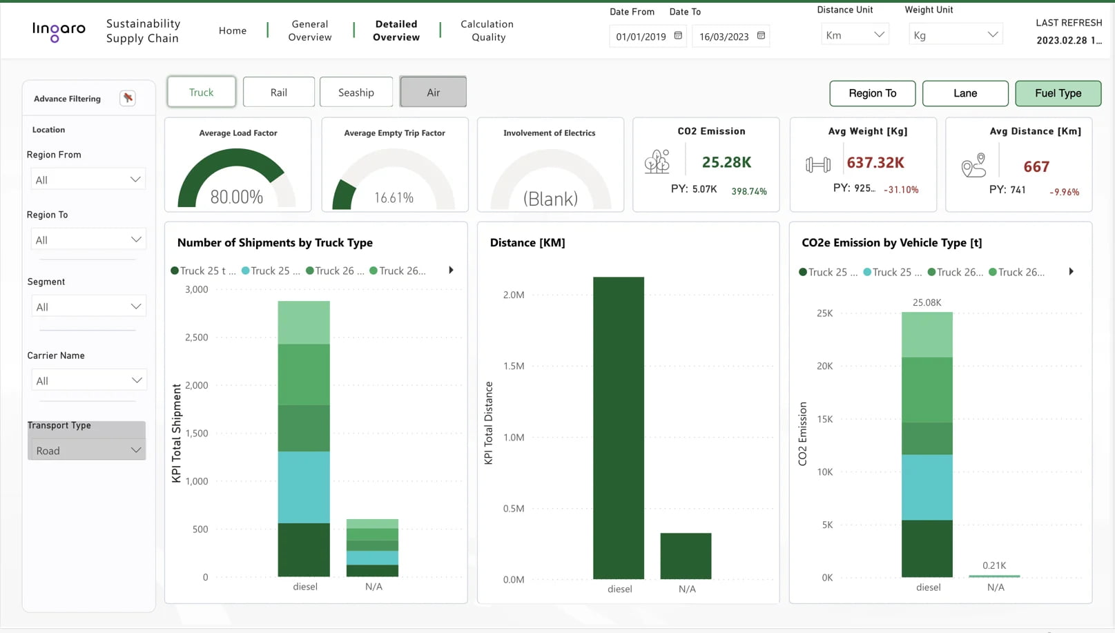 A sample visualization of an analytics-enabled dashboard showing how CO2 emissions in the supply chain are monitored and tracked against certain metrics and KPIs